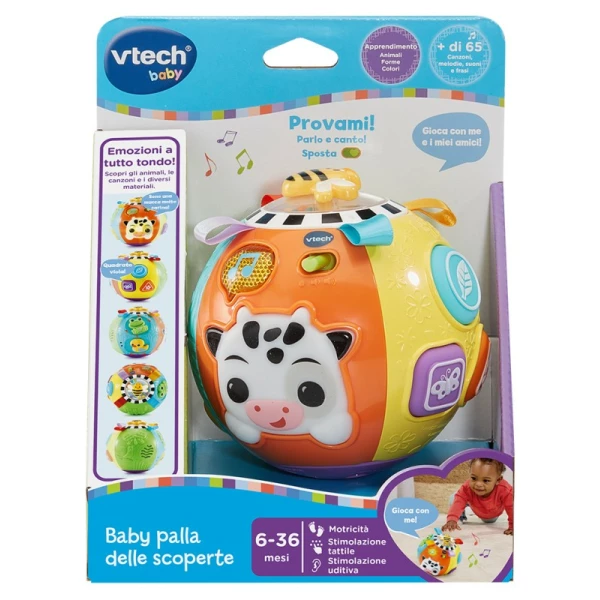 La VTech Baby Palla delle Scoperte è un giocattolo interattivo e coloratissimo, pensato per accompagnare i bambini dai 6 ai 36 mesi nelle loro prime, emozionanti esplorazioni. Un mondo di divertimento e apprendimento racchiuso in una palla che rotola!