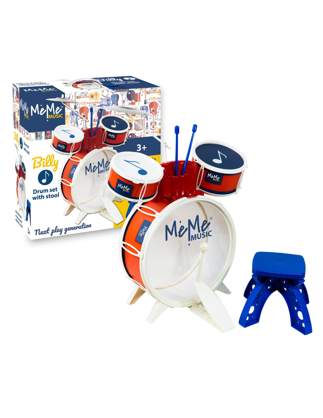 Set di batteria: grancassa con pedale, 2 tamburi laterali, piatto in metallo, 2 bacchette. Sgabello incluso. Suono realistico.
