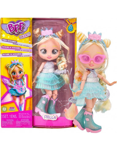 Scopri il mondo magico delle BFF Talents con Stella, la bambola alla moda e piena di talento! Con il suo look scintillante e i capelli biondi raccolti in due simpatici chignon, Stella è pronta a brillare in ogni occasione. Indossa un grazioso abito turchese con dettagli luccicanti e stivaletti colorati, perfetti per ogni avventura.