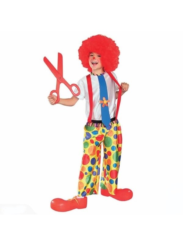 Un vivace costume da pagliaccio per bambini, perfetto per Carnevale, composto da pantaloni gialli a pois colorati, bretelle rosse, una grande cravatta azzurra.