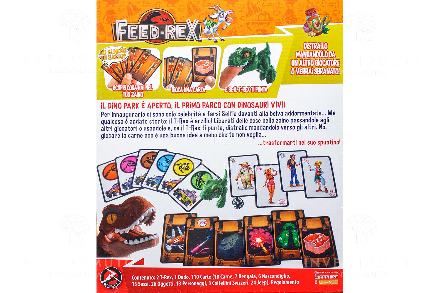 Contenuto: 2 T-Rex, 1 Dado, 110 Carte (18 Carne, 7 Bengala, 6 Nascondiglio, 13 Sassi, 26 Oggetti, 13 Personaggi, 3 Coltellini Svizzeri, 24 Jeep), Regolamento.