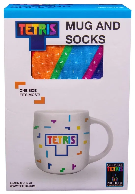 Novità regalo con un paio di calzini Tetris “taglia unica” e una tazza in ceramica con design dedicato ai blocchi di Tetris.