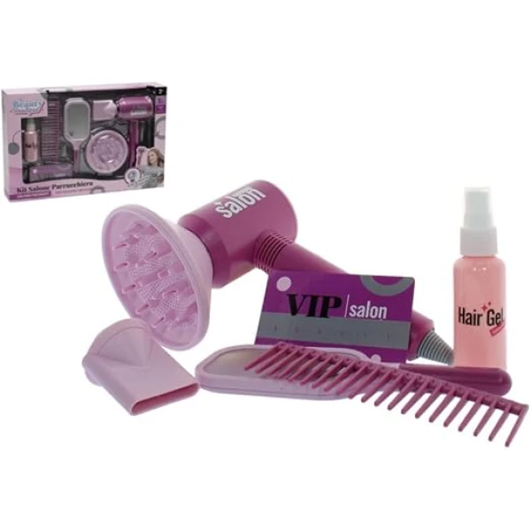 Set parrucchiere completo: tra cui asciugacapelli, diffusore, pettine, spazzola, bottiglia di gel e altri accessori del salone.