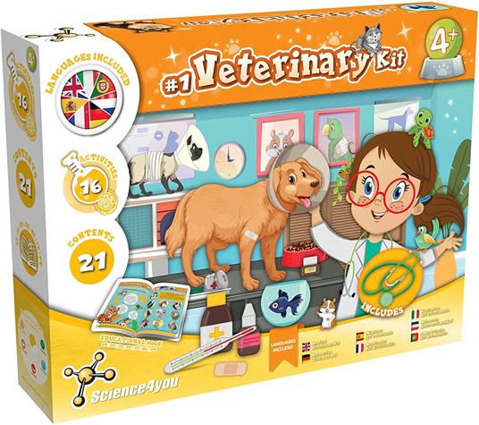 - In questo gioco veterinario troverai guanti, una maschera chirurgica e un costume da veterinario per giocare con i tuoi amici come veterinari. Libro didattico incluso in 7 lingue (spagnolo, inglese, tedesco, francese, italiano, olandese e portoghese), per guidarti attraverso questi fantastici esperimenti scientifici.