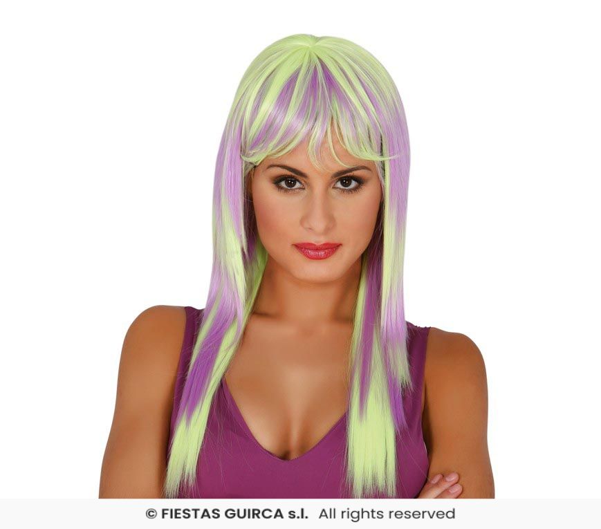 Parrucca Bicolore Neon Glam – Giallo Lime e Viola – Lunga