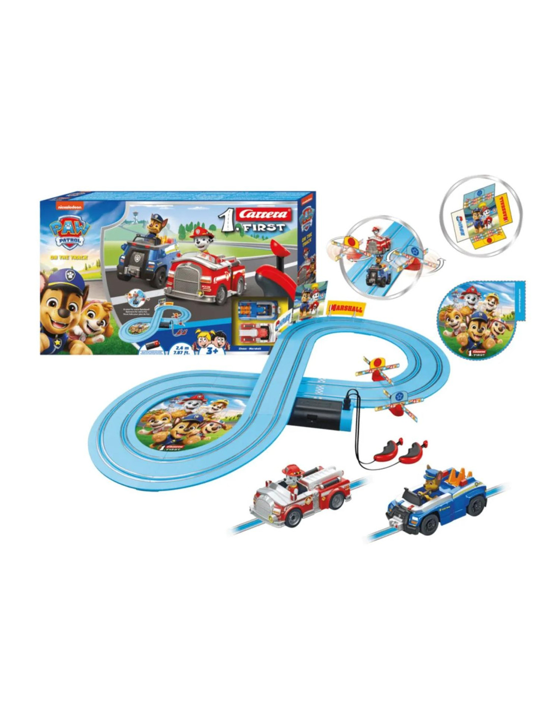 In questo set Carrera FIRST PAW Patrol – On the Track, il goffo dalmata Marshall, con il suo camion dei pompieri, e lo sportivo pastore Chase, con la sua auto della polizia, si sfidano.