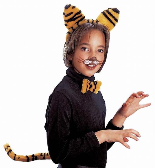 Un simpatico kit di accessori felini perfetto per Carnevale o feste a tema, composto da cerchietto con orecchie, papillon coordinato e una lunga coda tigrata. Gli elementi sono realizzati in morbido tessuto peluche con la classica fantasia a strisce gialle e nere.