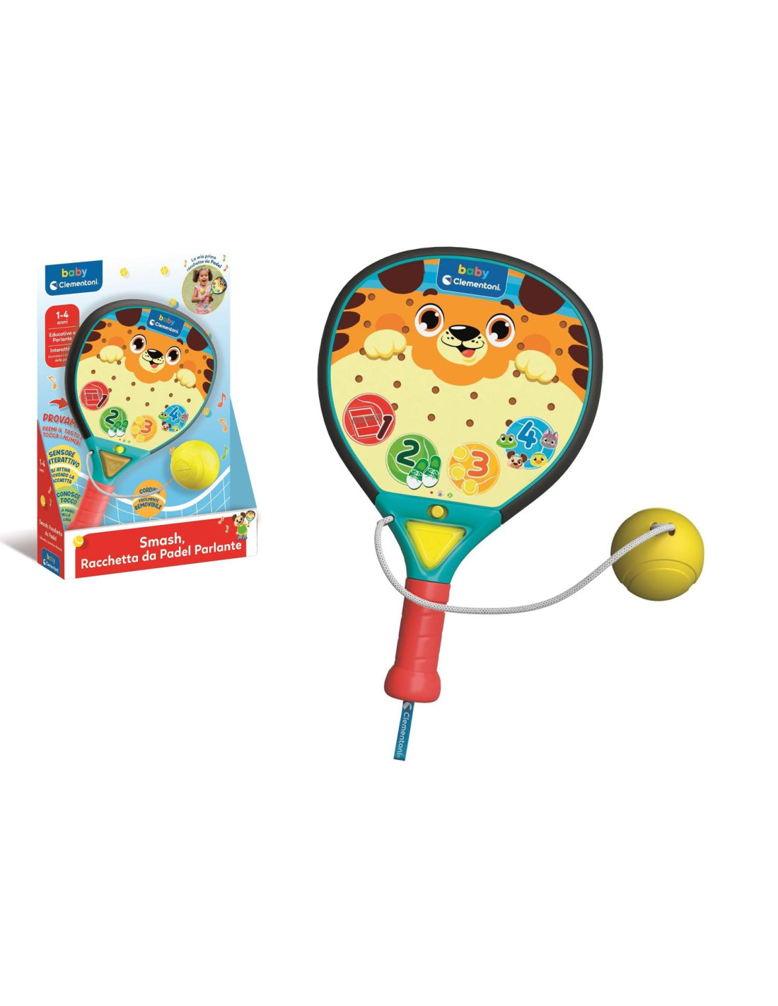 La racchetta e’ anche un centro attivita’ elettronico che insegna numeri e prime parole, invitando il bambino ad imitare i movimenti del padelista con canzoncine e rime.