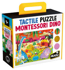 Un puzzle dei dinosauri con pezzi grandi e inserti tattili. Una volta ricostruito, il bambino farà tante esperienze sensoriali con le tessere speciali.