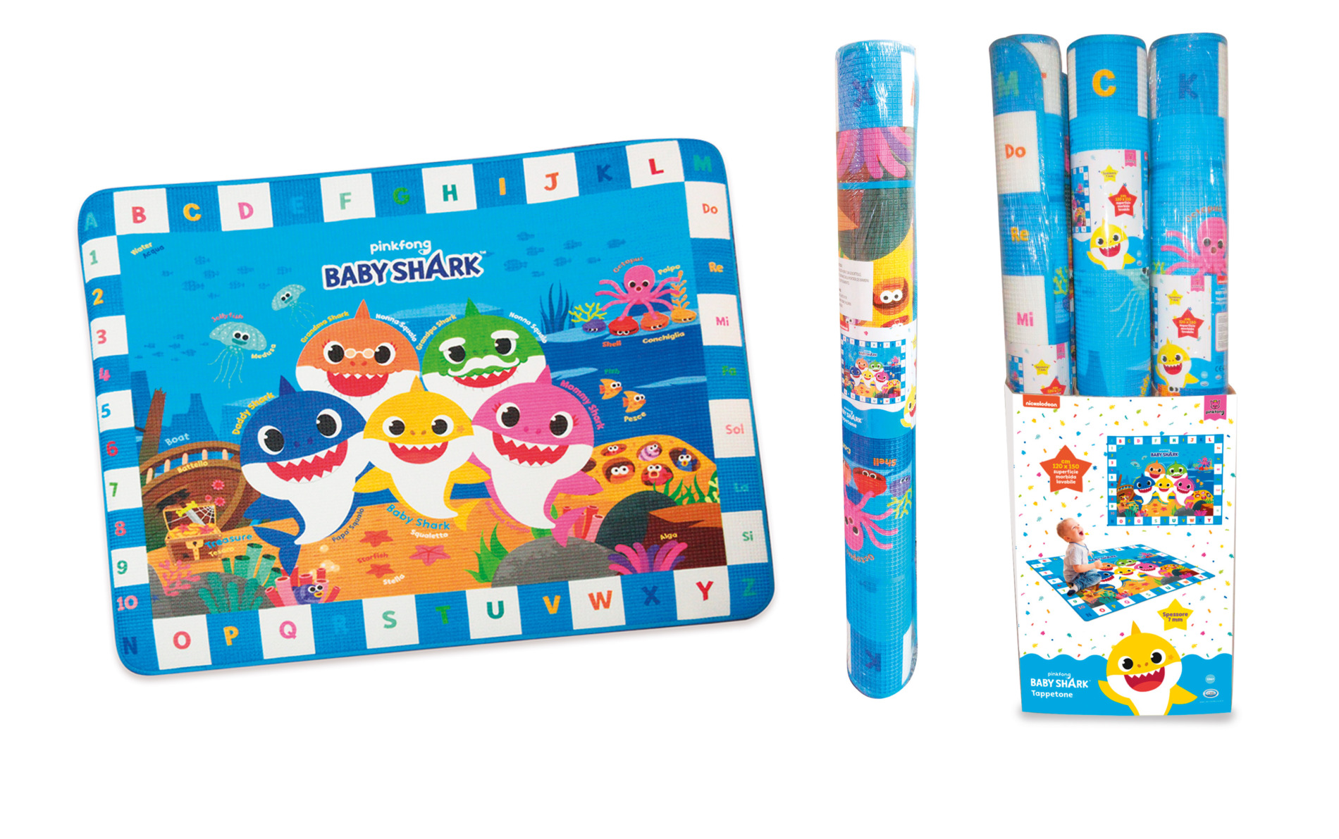 In sintesi, si tratta di un tappetone per bambini, decorato con il tema Baby Shark, dalle dimensioni generose e adatto per diverse attività ludiche.